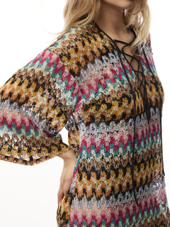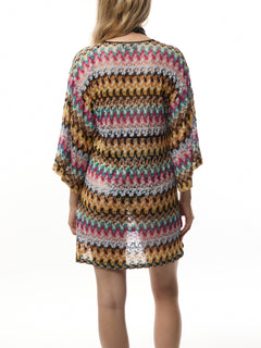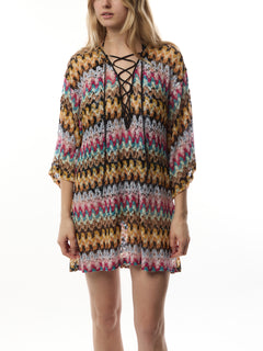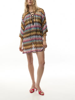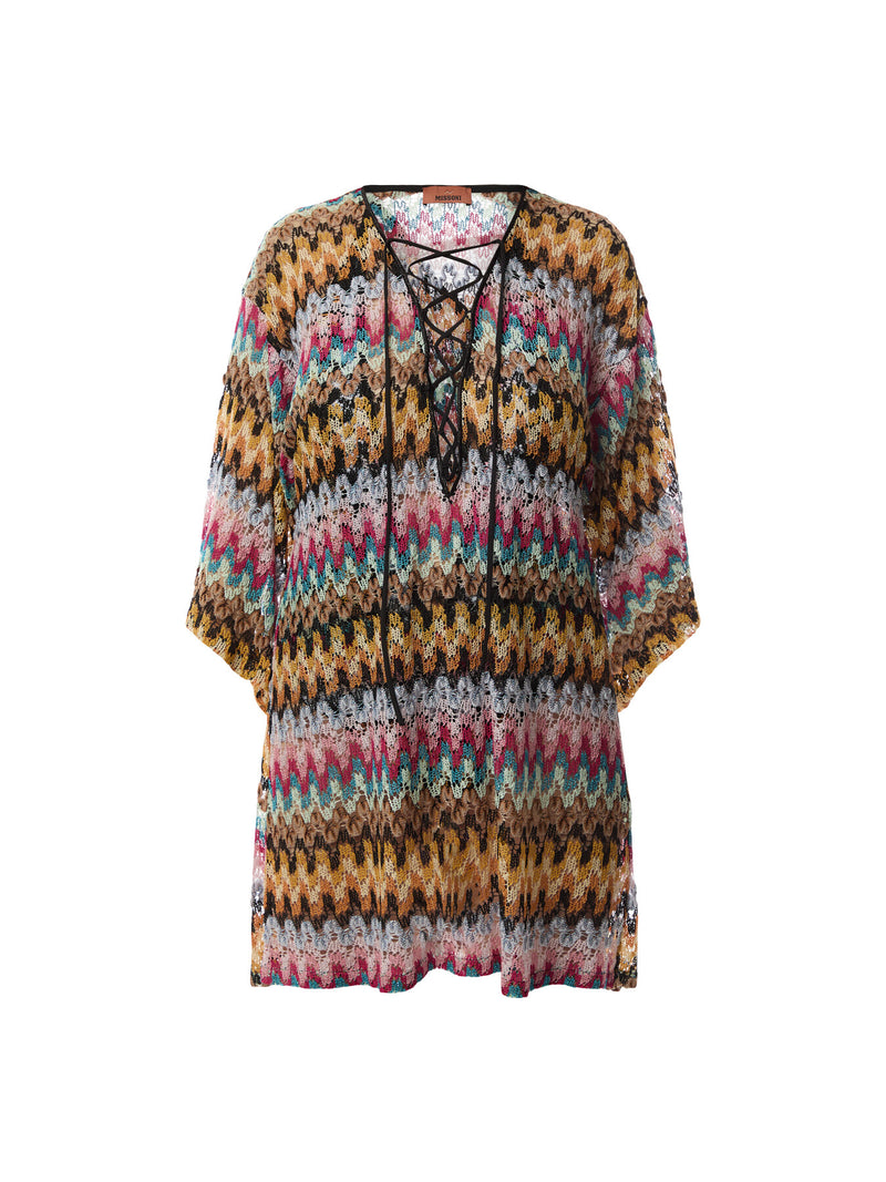 Lovers of beach life will not be able to resist the allure of the viscose-blend women's short cover-up presented by Missoni. The elegant kaftan design features wide sleeves and a delicate raschel knitwork with a chevron pattern offering a sophisticated and refined look. The plunging neckline with braided lacing adds a touch of sensuality, making this garment perfect for relaxing days at the beach.
