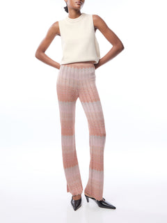 Perfected with a striped exhaust waistband, the flared trousers are embellished with a Greek zigzag pattern and lit up by the gleam of lamé. The profiles of the garment continue the decorative motif, for a result of extreme refinement.