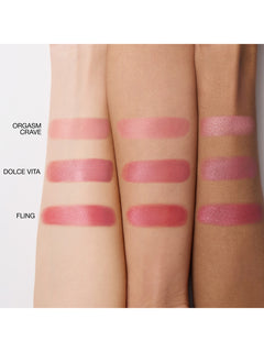 - Ingredient List: "ORGASM CRAVE: ISODECYL ISONONANOATE • SILICA • OCTYLDODECYL STEAROYL STEARATE • SYNTHETIC WAX • ISODECYL NEOPENTANOATE • C12-15 ALKYL BENZOATE • MICA • SYNTHETIC FLUORPHLOGOPITE • BARIUM SULFATE • ILLITE • LIMNANTHES ALBA (MEADOWFOAM) SEED OIL • SORBITAN ISOSTEARATE • SORBITAN SESQUIOLEATE • STEARALKONIUM HECTORITE • PRUNUS PERSICA (PEACH) KERNEL OIL • ETHYLHEXYLGLYCERIN • TOCOPHEROL • RHEUM PALMATUM ROOT EXTRACT • TOCOPHERYL ACETATE • ISOPROPYL TITANIUM TRIISOSTEARATE • ALUMINUM HYDROXIDE • TRIETHOXYCAPRYLYLSILANE • TIN OXIDE • WATER/AQUA/EAU • BUTYLENE GLYCOL • PHENOXYETHANOL • [+/- (MAY CONTAIN/PEUT CONTENIR): RED 40 LAKE (CI 16035) • TITANIUM DIOXIDE (CI 77891) • IRON OXIDES (CI 77491) • YELLOW 5 LAKE (CI 19140) • IRON OXIDES (CI 77499) • BLUE 1 LAKE (CI 42090)] • DOLCE VITA: ISODECYL ISONONANOATE • SILICA • OCTYLDODECYL STEAROYL STEARATE • SYNTHETIC WAX • ISODECYL NEOPENTANOATE • C12-15 ALKYL BENZOATE • SYNTHETIC FLUORPHLOGOPITE • MICA • BARIUM SULFATE • ILLITE • LIMNANTHES ALBA (MEADOWFOAM) SEED OIL • SORBITAN ISOSTEARATE • SORBITAN SESQUIOLEATE • STEARALKONIUM HECTORITE • PRUNUS PERSICA (PEACH) KERNEL OIL • ETHYLHEXYLGLYCERIN • TOCOPHEROL • RHEUM PALMATUM ROOT EXTRACT • TOCOPHERYL ACETATE • ISOPROPYL TITANIUM TRIISOSTEARATE • ALUMINUM HYDROXIDE • TRIETHOXYCAPRYLYLSILANE • WATER/AQUA/EAU • BUTYLENE GLYCOL • PHENOXYETHANOL • [+/- (MAY CONTAIN/PEUT CONTENIR): RED 40 LAKE (CI 16035) • TITANIUM DIOXIDE (CI 77891) • IRON OXIDES (CI 77491) • BLUE 1 LAKE (CI 42090)] • FLING: ISODECYL ISONONANOATE • SILICA • OCTYLDODECYL STEAROYL STEARATE • SYNTHETIC WAX • ISODECYL NEOPENTANOATE • C12-15 ALKYL BENZOATE • SYNTHETIC FLUORPHLOGOPITE • BARIUM SULFATE • ILLITE • LIMNANTHES ALBA (MEADOWFOAM) SEED OIL • SORBITAN ISOSTEARATE • SORBITAN SESQUIOLEATE • STEARALKONIUM HECTORITE • PRUNUS PERSICA (PEACH) KERNEL OIL • ETHYLHEXYLGLYCERIN • TOCOPHEROL • RHEUM PALMATUM ROOT EXTRACT • MICA • TOCOPHERYL ACETATE • ISOPROPYL TITANIUM TRIISOSTEARATE • ALUMINUM HYDROXIDE • TRIETHOXYCAPRY