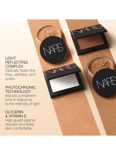 This selling pressed powder locks makeup in place all day with a luminous, photo-ready finish. PHOTO-FRIENDLY FORMULA THAT’S PERFECT IN ANY LIGHT. No-flashback formula incorporates Photochromic Technology that diffuses and adjusts to new sources of light so skin looks perfected in person, and on camera. NARS’ exclusive Light Reflecting Complex optimizes light reflection for a soft-focus effect.