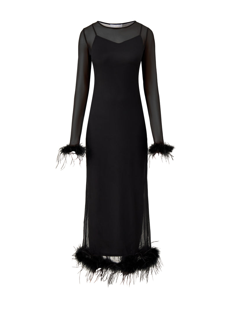 The Mesh Feather Trim Dress by Never Fully Dressed is crafted from sheer black mesh with feather cuffs. Designed to move effortlessly, it combines drama and elegance — a standout piece that balances playful texture with refined silhouette.