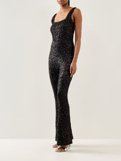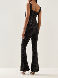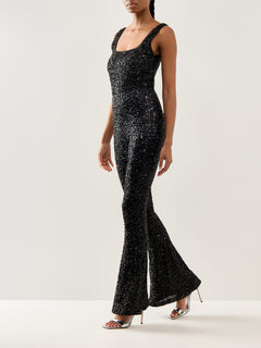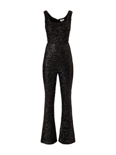 The Sequin Jumpsuit by Never Fully Dressed is a statement piece designed to dazzle. In black sequins with a flattering cut and fluid leg, it brings instant glamour to evening events or holiday celebrations.
