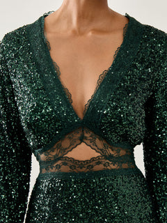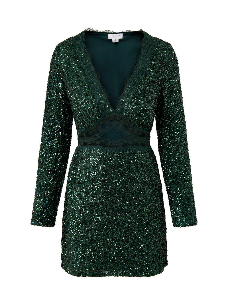 The Sequin Mini Dress by Never Fully Dressed shimmers in emerald tones for statement occasionwear. Cut to a flattering silhouette with long sleeves and a short hem, it’s perfect for parties or festive nights out.