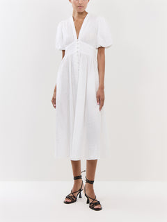 This White Short Sleeve Starlight Midi Dress features a flattering midi length and comfortable short sleeves, making it a versatile choice for various occasions. Its clean white color offers a fresh, elegant look that pairs well with both casual and dressier accessories. Ideal for warm weather, this dress combines style and ease for everyday wear or special events.
