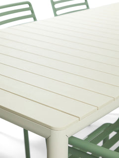 Nardi’s Mint Green Tevere Dining Set includes an extendable table and six chairs. Crafted from durable materials, it blends modern design with practicality. A contemporary dining set crafted for outdoor entertaining.