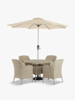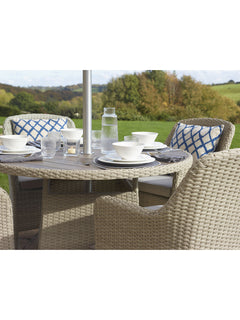 Make garden gatherings all the more sociable with this stylish dining set. Its eye-catching skirting and classic dining armchairs are sure to please. A parasol and base completes the set.Fawn Linen coloured cushions are made from our innovative Eco fabric, spun from recycled plastic bottles. The soft-touch cushions retain the hard wearing, season-proof quality that is synonymous with our outdoor fabrics. The all-weather, cloud coloured rattan is