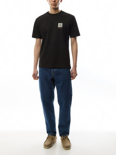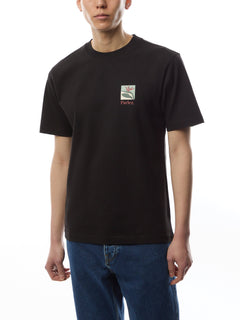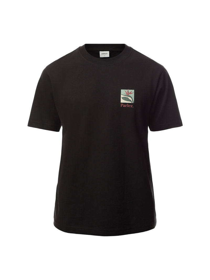 The Flora T-Shirt in Black. A short sleeve tee made from premium, GOTS Certified 100% organic cotton with a classic ribbed crewneck. Featuring a printed graphic on the chest and a larger printed design on the back.