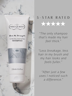 Percy & Reed Give Me Strength Strengthening Shampoo, is dermatologically tested and laboratory proven to leave hair 5x stronger after just one use, when followed with Give Me Strength Strengthening Conditioner. This revolutionary hair strengthening shampoo reduces hair breakage, strengthens hair strands and promotes new hair growth with every wash.