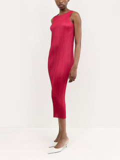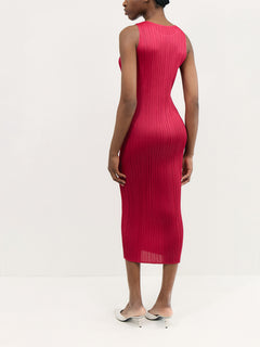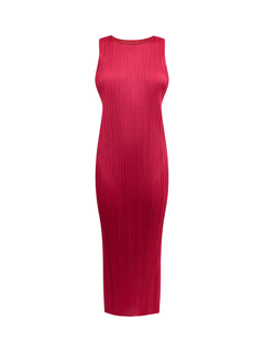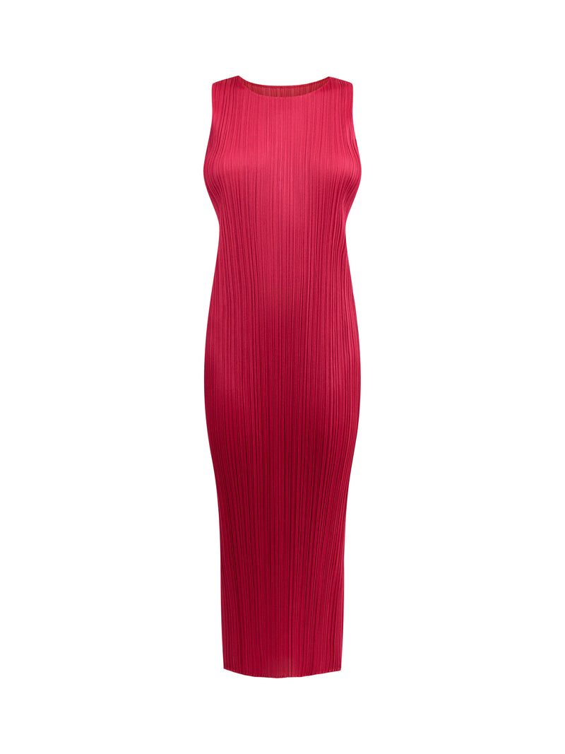 This sleeveless dress features a mock neck design and vibrant carmine pink hue, combining classic pleats with a modern silhouette. Its lightweight fabric and structured fit make it ideal for both casual and dressier occasions, offering comfort and style in one versatile piece.