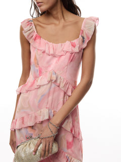 Lightweight chiffon fabrication, Fully lined so not sheer. Elasticated shoulder straps & Tiered ruffles through bodice. Zip and hook fastening is concealed at back.
