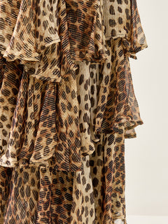 The Farrah Maxi Dress by Queens of Archive is cut in a tiered silhouette with cheetah print lurex. A fluid, movement-led piece for statement occasions.