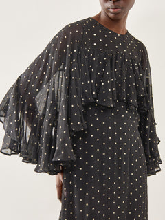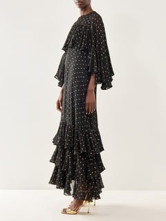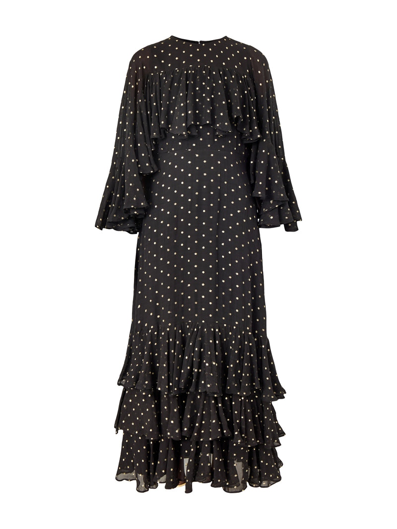 The Petula Maxi Dress by Queens of Archive is defined by its caped shoulders and gold dot lurex. A dramatic silhouette made for event-led moments.