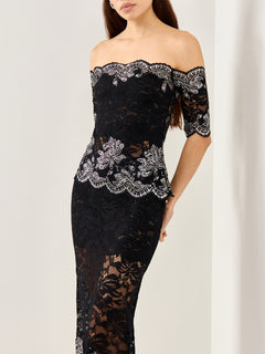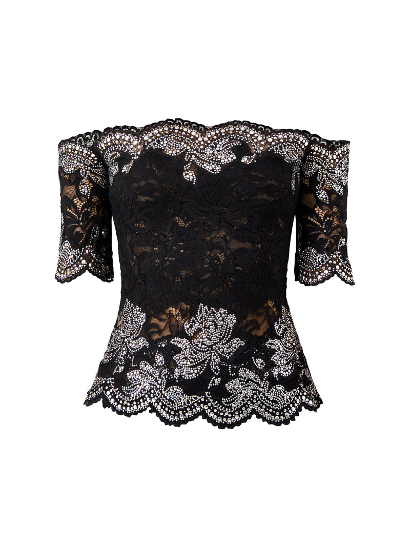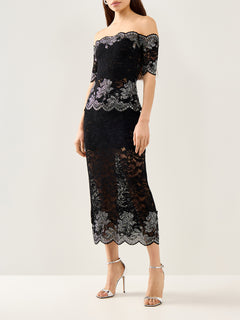 The Off Shoulder Dropped Lace Top by Rabanne combines delicate lace with an off-shoulder neckline for expressive feminine structure. Its soft drape brings dimension to refined evening looks. A thoughtfully detailed statement piece.