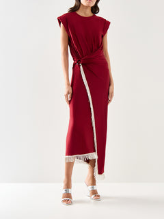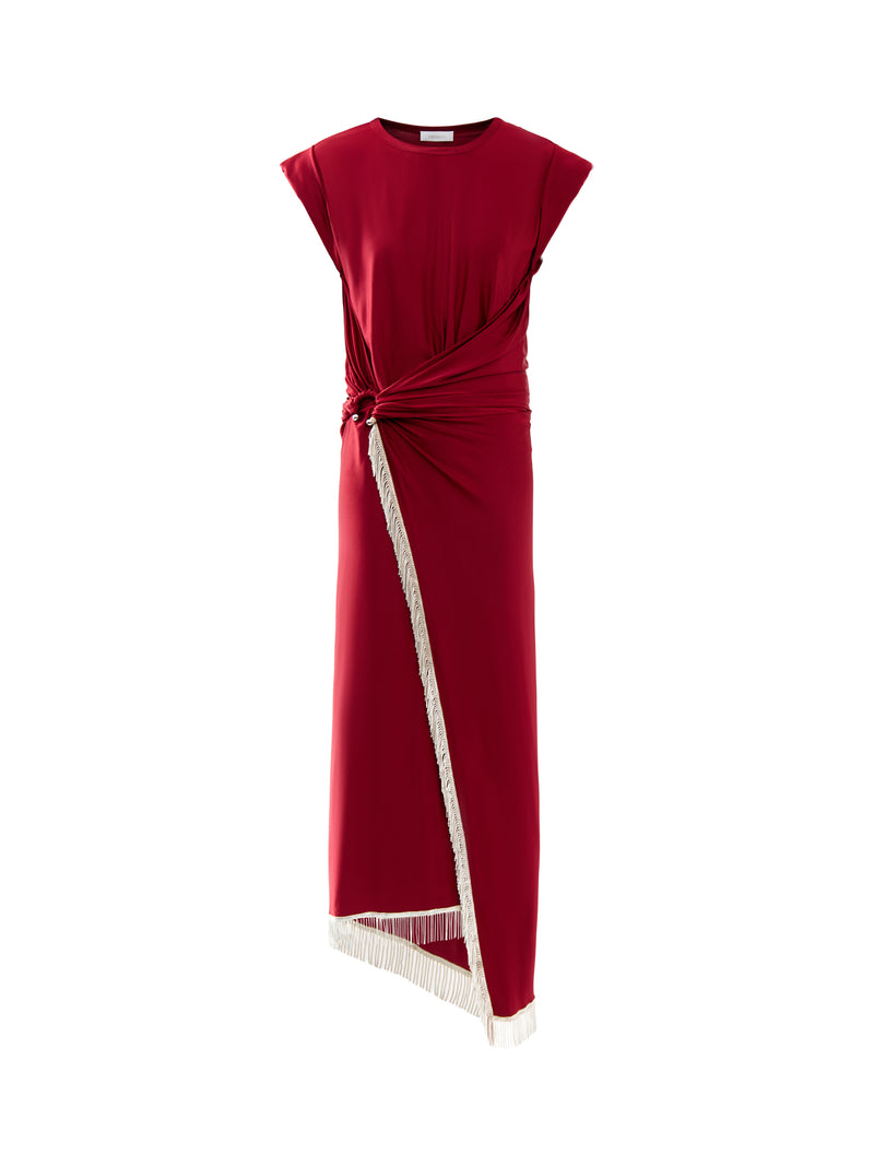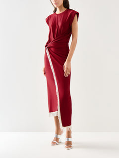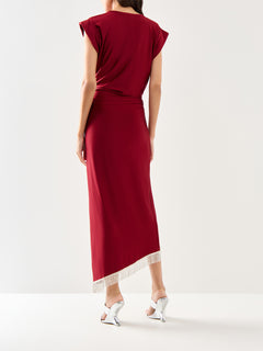 This short-sleeve dress is crafted from stretch jersey fabric, offering a comfortable and flattering fit. It features silver hardware details that add a subtle touch of sophistication, making it suitable for both casual and dressier occasions. The design combines ease of wear with stylish accents for versatile wardrobe appeal.