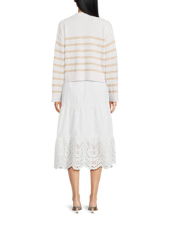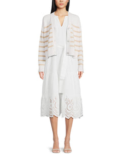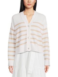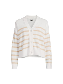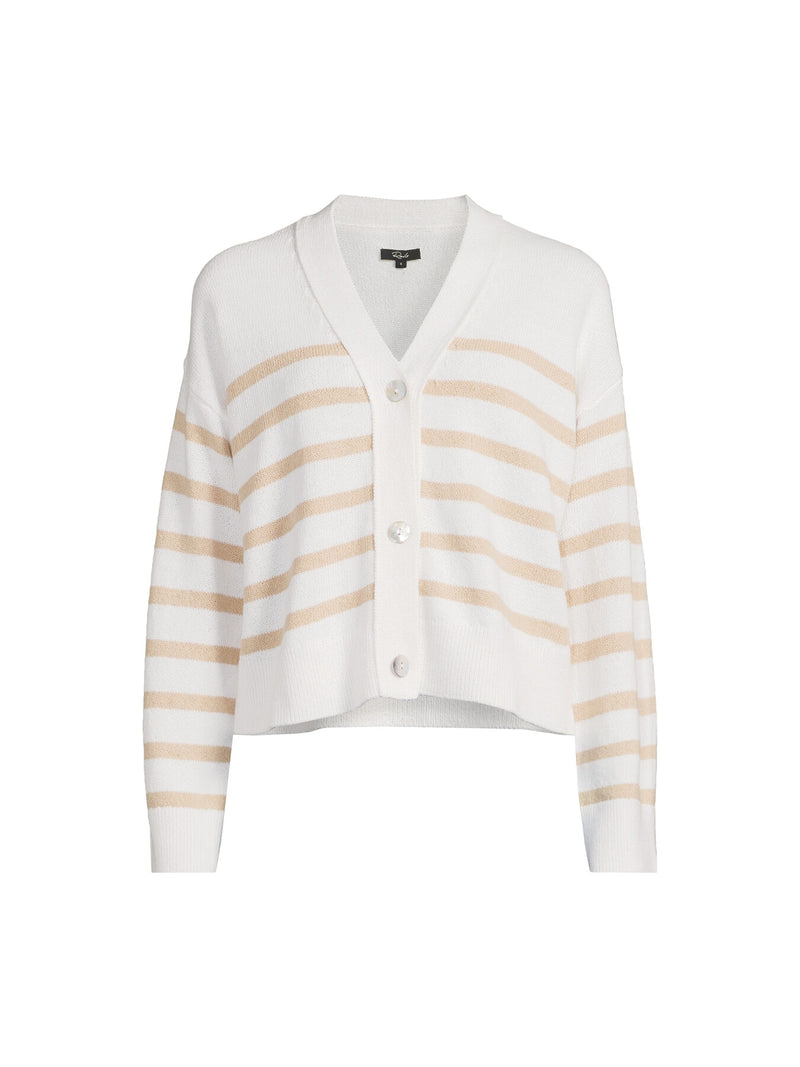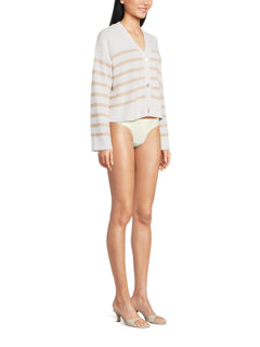 A cotton blend cardigan featuring large natural shell buttons, the Geneva has a sand-striped design for a neutral aesthetic that is suitable for layering.