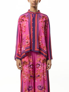 Introducing the Alina Pink Shirt, a vibrant addition to any fashion-forward wardrobe. This statement piece features a bold floral print with a rich fusion of purple and Blue hues, set against a lively pink background. Accented with magenta and Blue trims for a touch of elegance, it has a structured collar and billowing bell sleeves for a chic, modern look. Perfect for brightening up the office or a casual day out.
