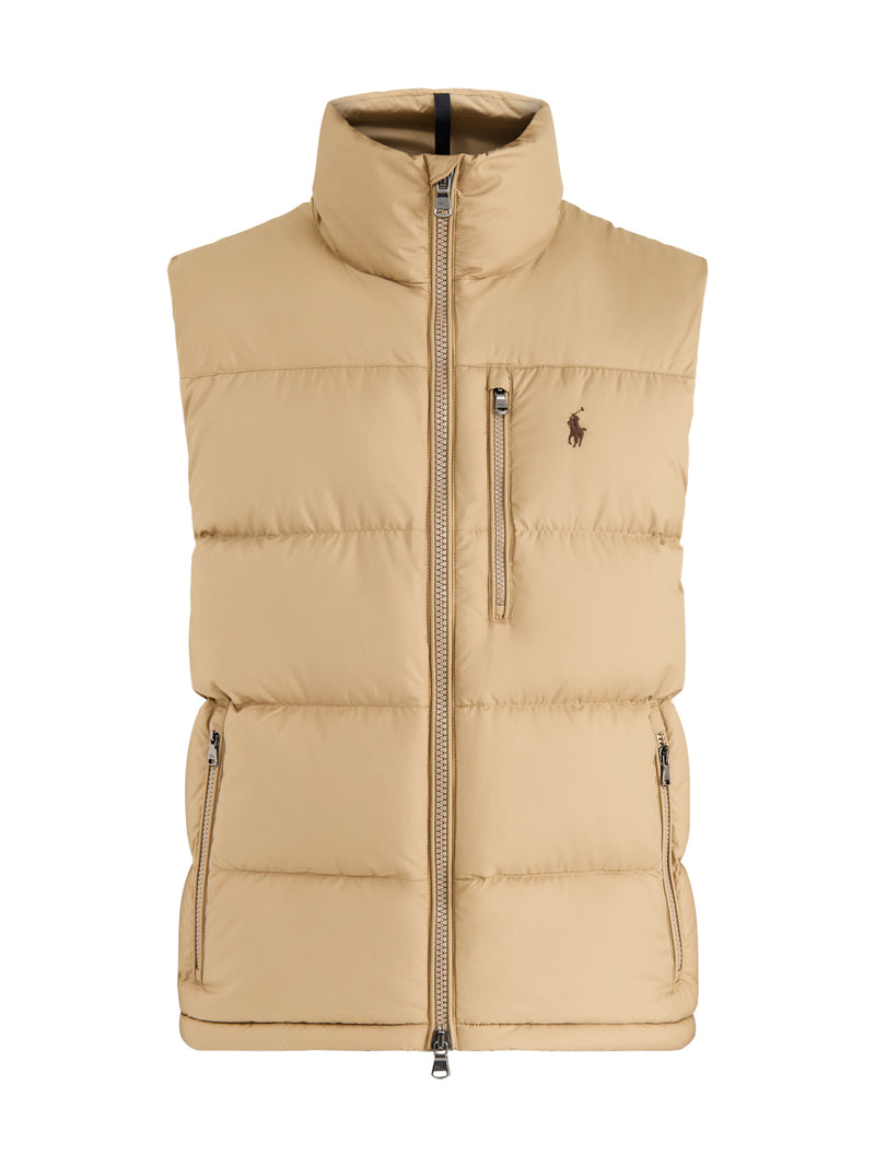 The Gorham Puffer Gilet by Ralph Lauren is crafted from water-resistant nylon with channel quilting and down fill. A high collar and secure zip pockets make it a practical yet refined layering piece.