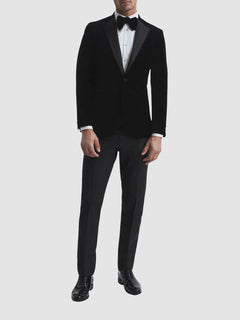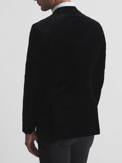 The Ace velvet blazer in black is the party piece that will earn you sartorial points season-after-season. Finished with traditional details such as a single-breasted silhouette and contrasting satin trim, its versatile colourway and sumptuous texture combine to make a truly timeless garment. Style it with a dress shirt, bow tie, tuxedo trousers, and patent shoes for classic evening style. Velvet fabrication Satin notch lapels Single-b