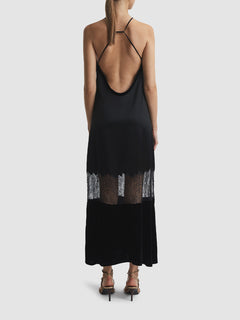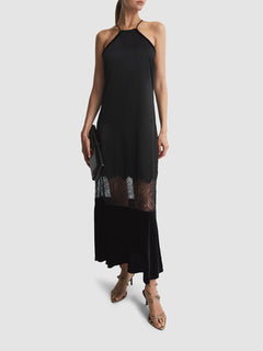 The black Janelle dress experiments with fabrics for a luxury hand-feel and appearance. It’s constructed with a satin bodice which sits close to the frame, and a lace panel is added to the length. Below this, a split velvet panel finishes the look. Style with gold-tone accessories for a Hollywood-inspired glamour.Satin-velvet construction Halter necklineOpen-back designLace panel Zip closure to side Side slipMidi length Fitted