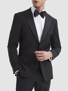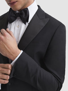 Water-repellent and crease-resistant to maintain form, the black Poker modern-fit single-breasted tuxedo jacket is a practical and luxe option, elevated with satin detailing. Choose the matching trousers for sartorial perfection.Water-repellent and crease-resistant Wool blend Single breastedPeak lapels Satin detailing Single-button fastening Long sleevesButtoned cuffs Jetted pocketsDual vents to reverseLinedModern fit