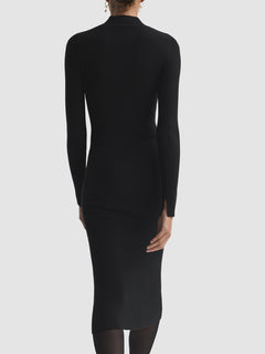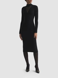 Renew your knitwear this season with the black Sabrina midi dress. It’s woven from a ribbed wool blend into a bodycon silhouette for a snug wear from day to night. A mesh panel features below the funnel neckline, a subtly alluring element which can be elevated with accessories.Wool blendRibbed fabricationFunnel necklineMesh panel to chestLong sleevesSplit cuffsMidi lengthBodycon fit