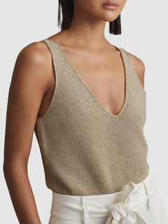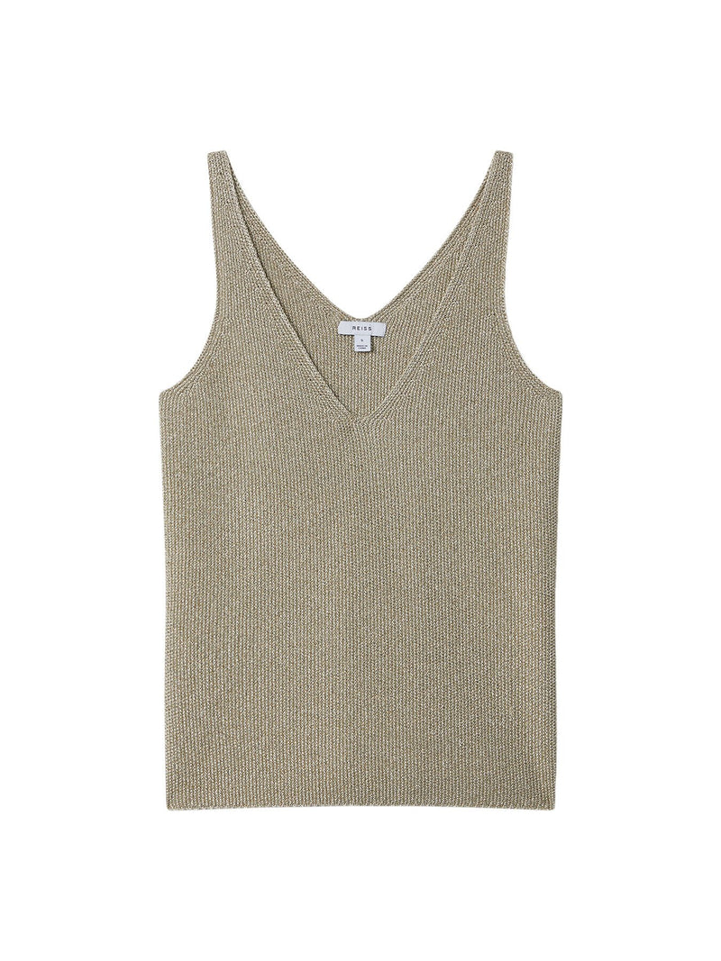 The Mika Metallic V-Neck Vest by Reiss delivers sleek shine with a fluid drape. Designed for effortless layering, it elevates evening or occasion looks instantly. A chic wardrobe highlight.