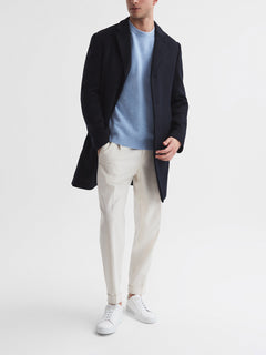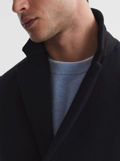 The Gable overcoat in navy is crafted from a wool-blend for a soft feel and superior insulation, cementing its place in your cool-weather rotation for seasons to come. Wear over formal pieces for special occasions, then with a hoodie and jeans for a modern-casual mood. Wool blendSingle breastedNotch lapels Three-button fastening Long sleevesSide-slip pocketsVent to reverseLined
