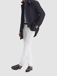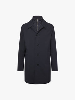 Stay dry in style courtesy of the navy Perrin mac. Designed with a removable funnel-neck insert, it brings an unrivalled versatility to your outerwear repertoire. The insert can be zipped close, adding extra warmth for cooler days, or it can also be removed for milder weather. The longline silhouette ensures it works well with both tailored and smart-casual looks.Longline silhouetteRemovable zip-through funnel-neck insertSingle breastedFive