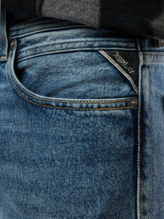 Straight-fit jeans with a regular-rise waist and a straight leg from hip to hem for a comfortable fit. This five-pocket piece comesin 12-oz pure cotton indigo denim with a mid wash. The back pockets have our iconic gull-wing stitching and one pocket bears R embroidery, while one of the front pockets features a small branded insert. Button fastening.