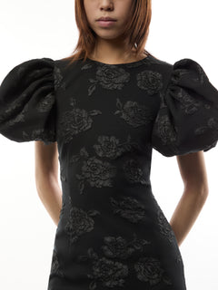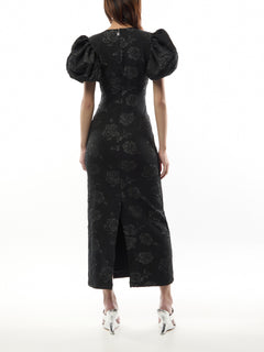 The jacquard midi dress has a long and tight-fitted silhouette with puffy sleeves. It has a round neck and closes at the back with an invisible zipper. The dress is made in a beautiful jacquard fabric, which gives the dress an elegant look.