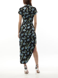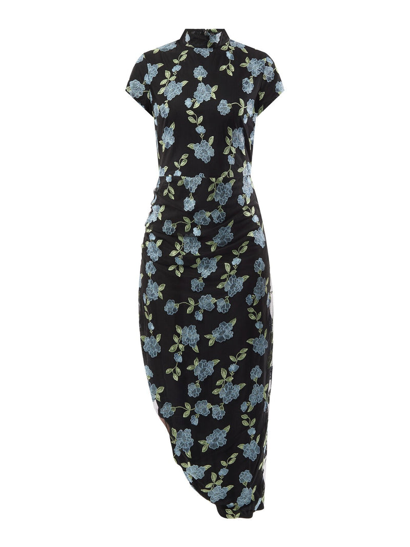 The Mesh Asymmetric Dress features a high neckline and cap sleeves, with a ruched waist to enhance the silhouette. The dress has an asymmetrical hemline with a side slit and a back zip closure for easy wear. Detailed with floral embroidery throughout.