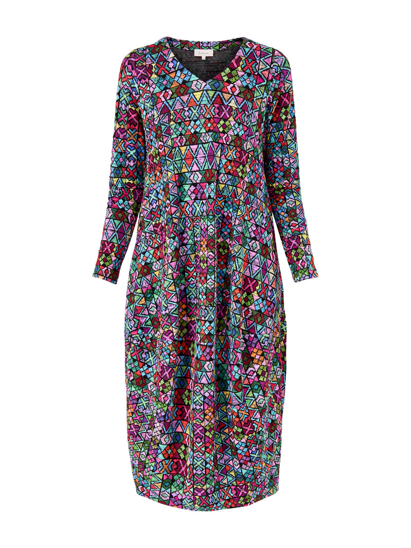 This Peruvian Stitch Patchwork Dress Multi showcases vibrant patchwork inspired by traditional Peruvian stitching techniques. Crafted for comfort and style, its colorful design adds a unique, artisanal touch to your wardrobe. Ideal for casual wear, the dress blends cultural detail with versatile fashion.