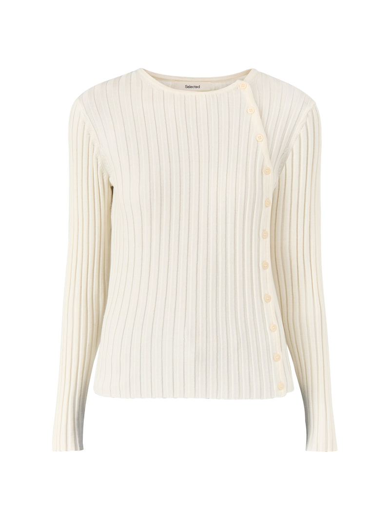 The Helen knit button top by Selected Femme is designed with a crew neck and long sleeves. Made in soft yarn with button details, it reflects comfort and simplicity. A knitwear staple built with timeless appeal.