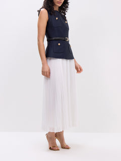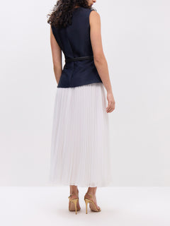 This navy taffeta midi dress offers a sleek silhouette with a subtle sheen, perfect for elegant occasions. Its midi length provides a balanced, sophisticated look, while the taffeta fabric adds structure and a touch of luxury. Ideal for formal events or stylish evenings out, this dress combines classic design with modern appeal.