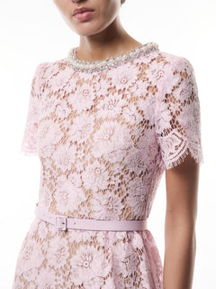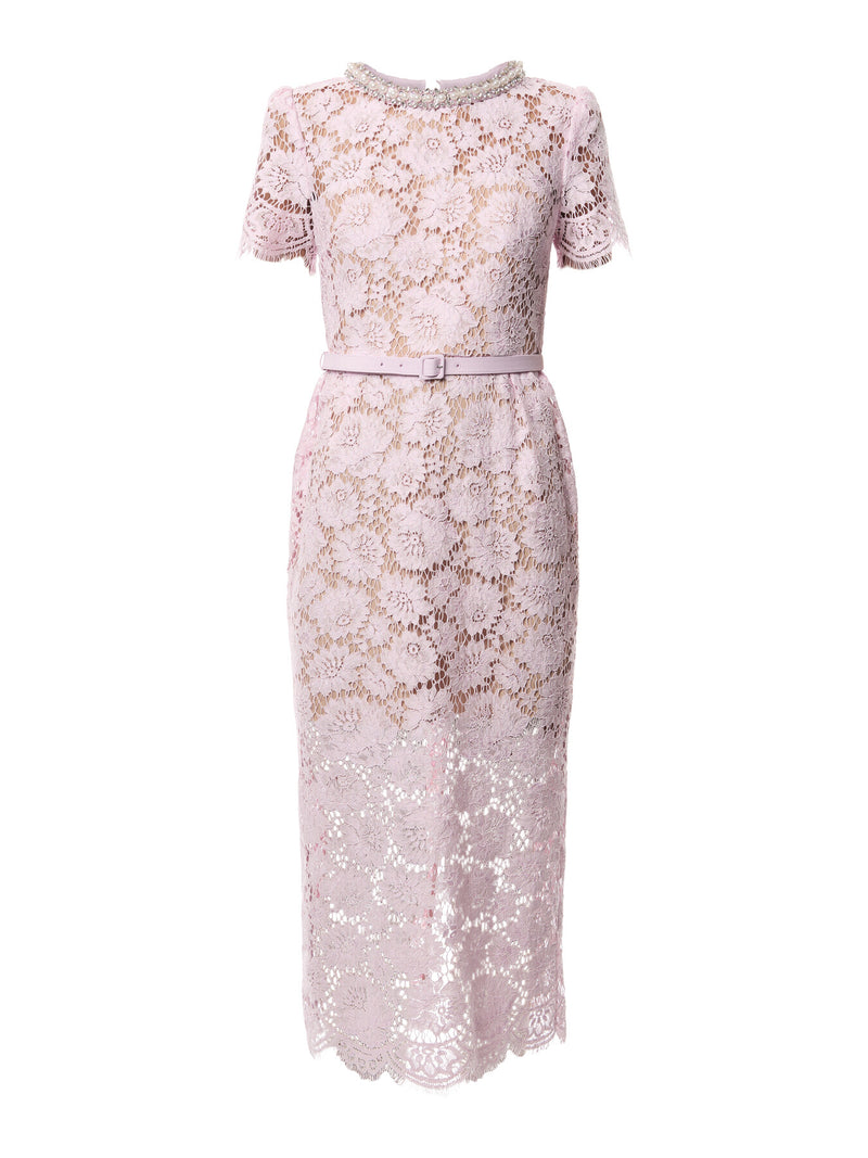 Blossoming in pink, this midi dress is crafted from our signature lace for romantic effect. Match its pearl trims with a pair of our statement earrings, and wear with heels for a wedding party.Featuring a fitted style with minimal stretch, zip closure at back, partially lined to knees and removable belt.