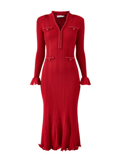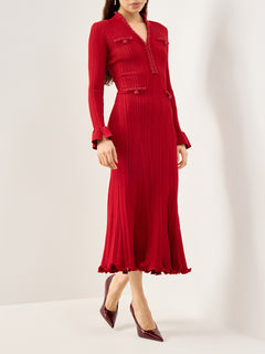 Red Pearl Trim Knit Midi Dress Red