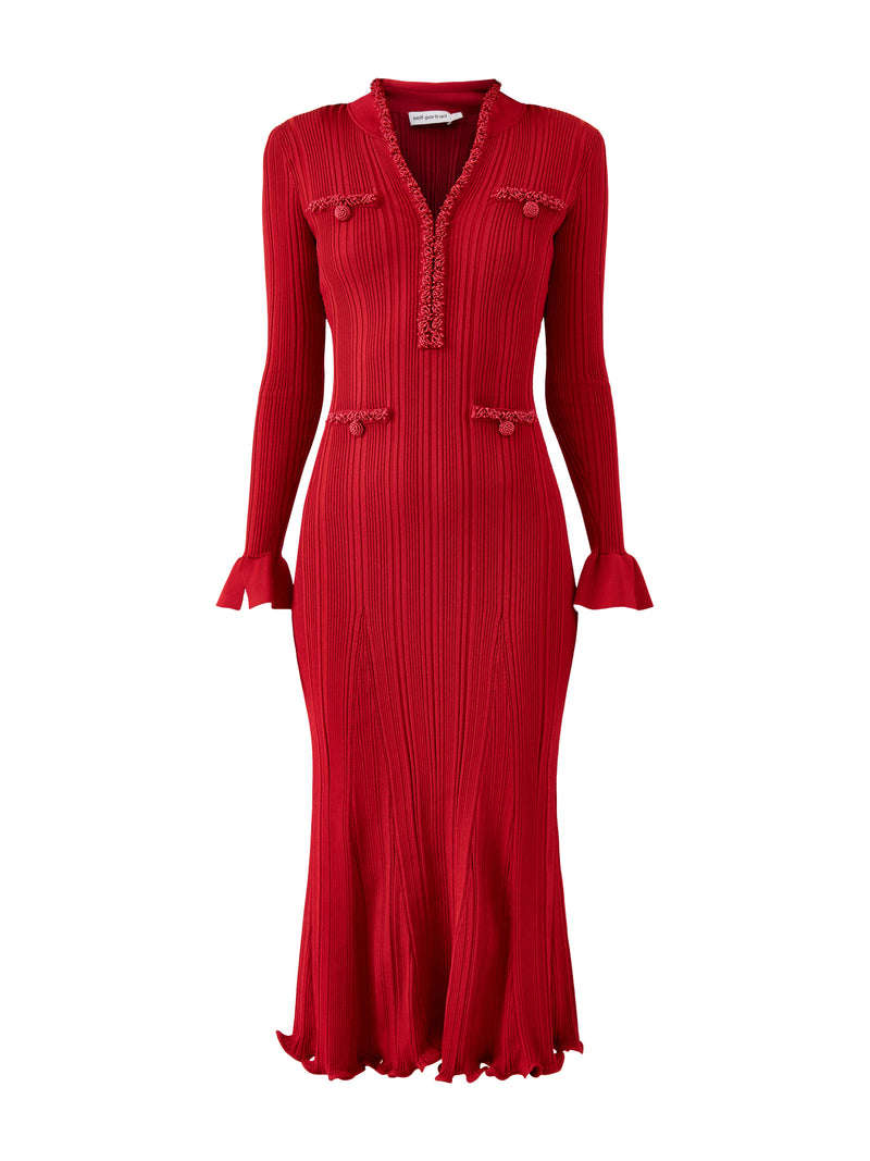 The Red Pearl Trim Knit Midi Dress Red by Self-Portrait pairs a smooth knit construction with refined pearl accents along the neckline. Its fitted silhouette creates clean, feminine lines. A polished day-to-evening option.
