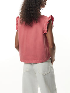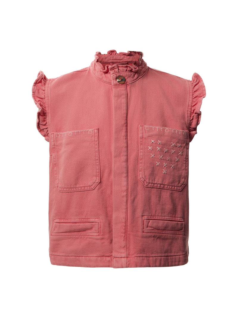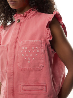 Simple but elegant, the Seventy + Mochi Dear Pablo Mineral Red Waistcoat features a subtle heart stitch detail on the pocket and a charming frill collar. Pair it with the matching set for a polished and stylish look.
