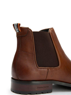 The Clover Chelsea Boots by Simon Carter are made from supple tan leather with elasticated gussets and tonal stitch detailing. A sleek almond toe and stacked heel lend understated refinement.