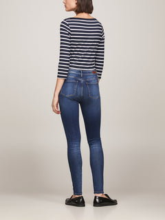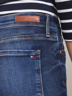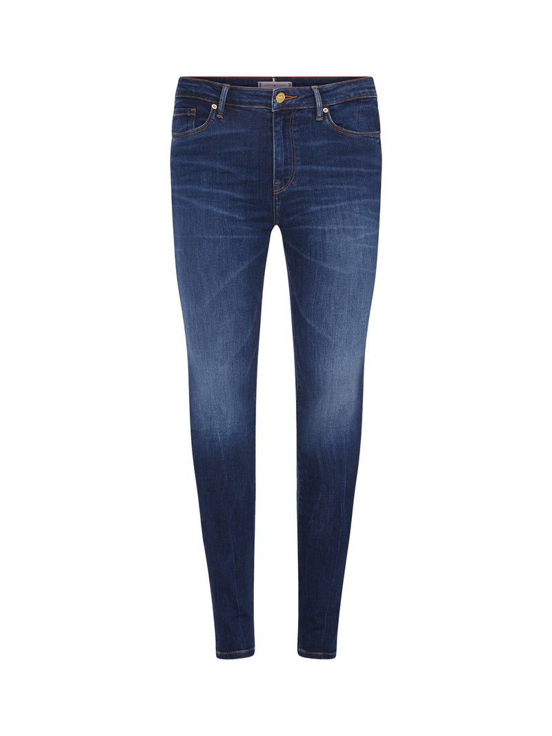 Rock a statement street style in these skinny fit jeans, featuring faded detail for vintage flair.Highlights Stretch organic cotton denim Fading at thighs, knees and back Zip with button closure Five-pocket styling Branded button Signature tape inside waistline Tommy Hilfiger logo patch on waistline Tommy Hilfiger flag embroidery on back pocket