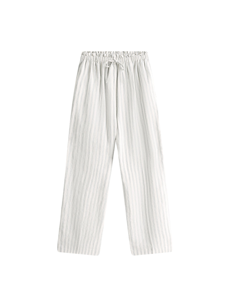 These pure linen shorts feature an adjustable drawstring waist and multiple pockets for comfort and convenience. Their vertical stripe design and subtle branding make them perfect for warm-weather wear.