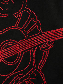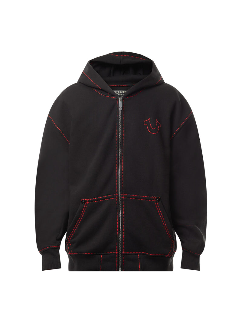 rue Religion Full Zip Hoodie In Black. A full front zip fastening with a large hood. Ribbed designs to the cuffs on the long sleeves and waistband. Two pouch pockets at the waist which feature branded metal rivets on the corners. The signature True Religion Horseshoe logo is situated on the left of the chest with the large Buddha logo on the reverse both in a red stitch design. All over stitch details in red. A soft fleece interior.