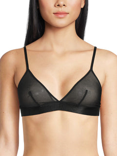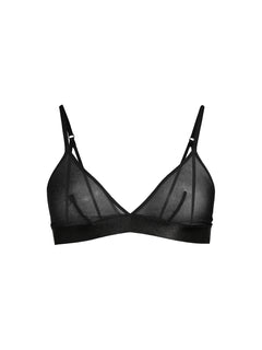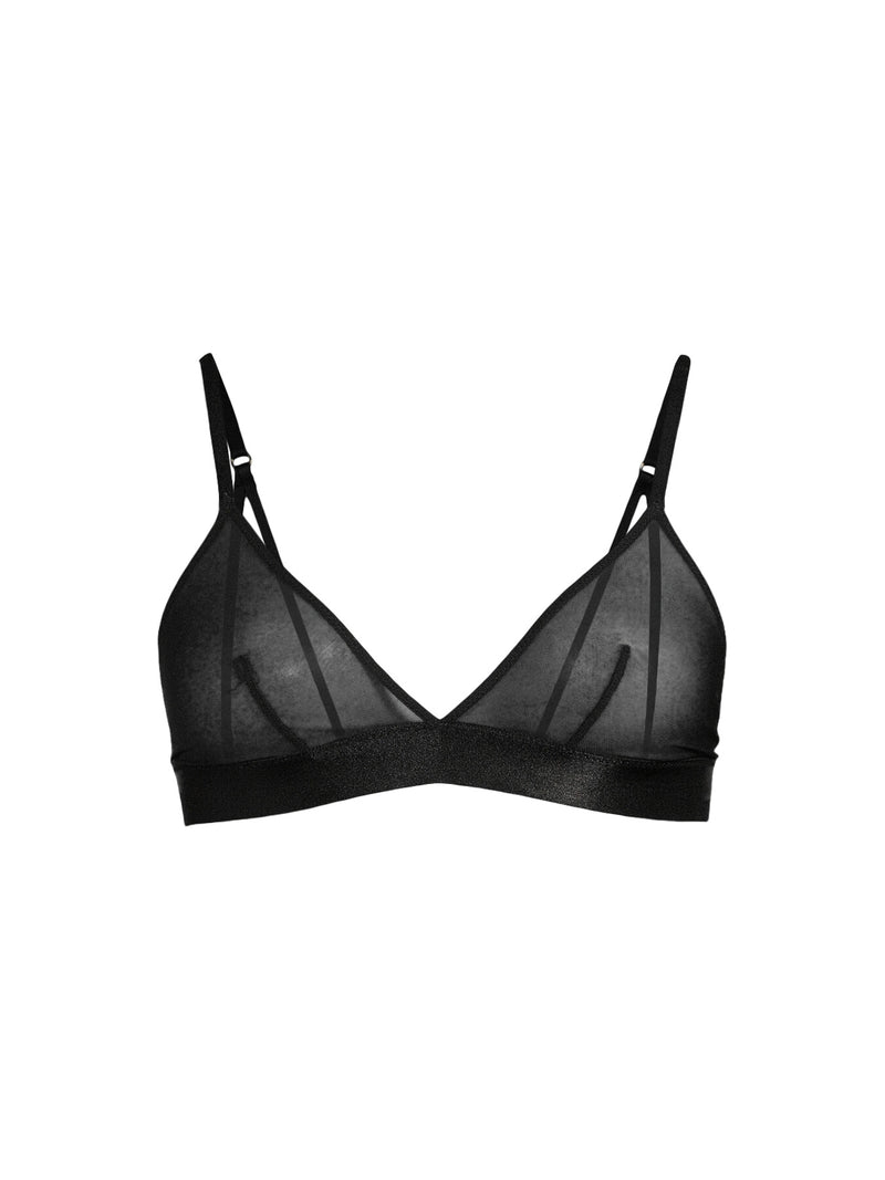 Bralette featuring Triangle shaped cups in a soft, sheer mesh, slightly extended towards the sides, as well as a soft but firm elastic underband for increased support.