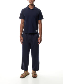 Introducing the Hi Water Trouser in Black Twill. These pants feature a cropped length and loose fit, making them ideal for high tide. Designed to sit above the ankle, they offer both style and practicality. Stay comfortable and dry in these unique trousers.
