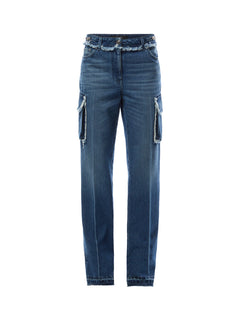 These medium-wash cargo jeans feature frayed edges and are accented by Medusa '95 hardware on the waist.
