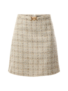 This A-line mini is crafted from a mixed tweed with lurex threading, featuring an accent Medusa '95 hardware on the waist.