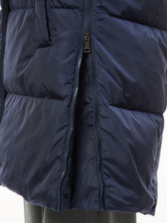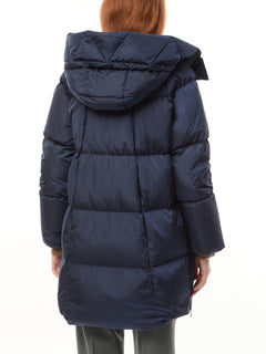 Midi parka in water-repellent nylon taffeta fabric featuring goose down padding and all-over horizontal-stripe quilting. The slightly flared model boasts deep side zips at the hem, a drawstring hood, welt side pockets and long raglan sleeves. Concealed zip fastening.