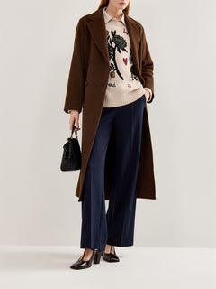 The Zufolo Double-Breasted Coat by Weekend Max Mara is cut from a rich wool blend in deep chocolate brown. Featuring peak lapels and a longline silhouette, it reflects the label’s timeless tailoring and quiet sophistication-an enduring outerwear investment.