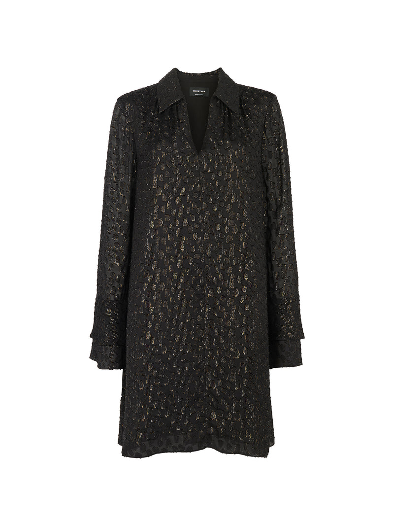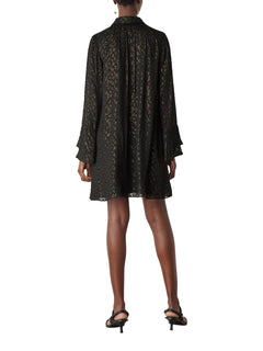 The Metallic Dobby Mini Dress by Whistles shimmers with fine metallic threading through lightweight chiffon. Cut to a relaxed A-line silhouette with soft blouson sleeves, it captures an understated evening mood.