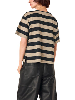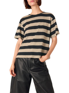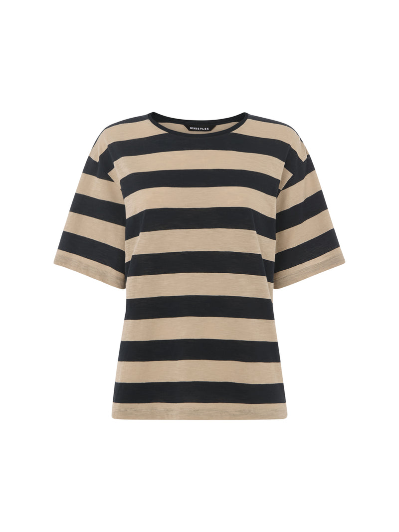 The Wide Stripe Tee by Whistles introduces bold contrast striping to a relaxed cotton silhouette. Soft jersey lays smoothly under blazers, knitwear or lightweight jackets. A versatile separate that pairs naturally with denim, soft tailoring and neutral layers.